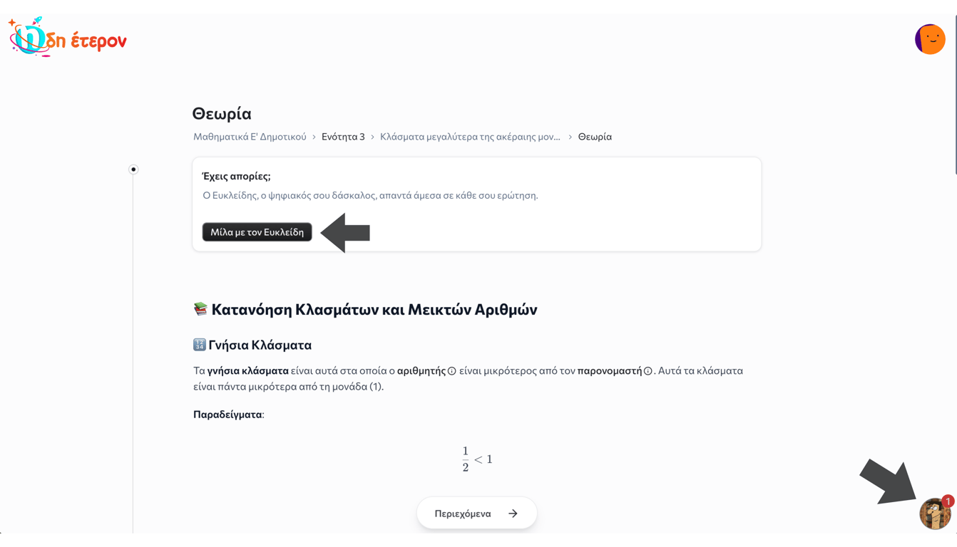 Ο Ευκλείδης, ο καθηγητής του ήδη-έτερον, φέρνει την εκπαίδευση πιο κοντά στο μέλλον. Αν δεν έχει γίνει ακόμα δοκιμή αυτής της καινοτόμου λειτουργίας, αρκεί η σύνδεση στον λογαριασμό και ένα κλικ στο κουμπί του Ευκλείδη, κάτω δεξιά. Ανακάλυψε πώς μπορεί να συμβάλει στην καλύτερη κατανόηση της ύλης και στη βελτίωση της απόδοσης και των βαθμών!
