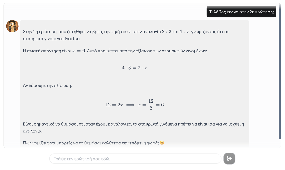 Κάθε λάθος μετατρέπεται σε ευκαιρία για μάθηση! Ο Ευκλείδης σου εξηγεί τι δεν πήγε καλά και σου δείχνει τρόπους για να βελτιωθείς.